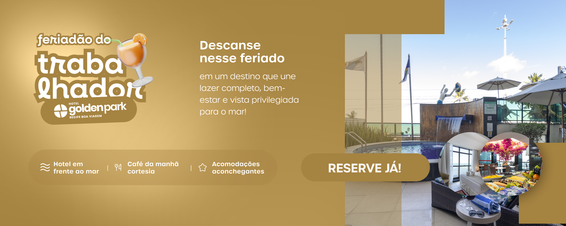 O café da manhã no Golden Park Recife Boa Viagem é cortesia para os hóspedes. São servidos diversos itens como bebidas quentes, sucos, pães, cereais, manteiga, laticínios, frios, frutas, bolos e doces. O restaurante é exclusivo para o café da manhã. Já para um lanche rápido durante a tarde ou à noite temos a nossa loja de conveniência funcionando durante 24 horas.